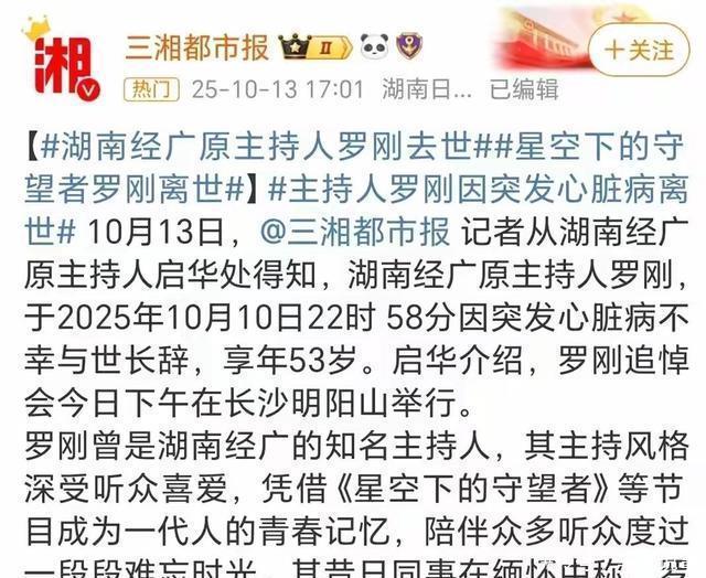 文稿|悦溪谈 编辑|悦溪谈 听到这个消息让人很悲痛! 年仅53岁前湖南知名主持人罗刚因病去世! 前言 金秋十月的寒气,总带着刺骨的劲,往身体里钻,还没能给故人说声“添衣安好”,他便匆匆离去,53岁突发心脏病,走的还算安详。 故人虽已“远去”,精神却像不灭的光,想起那夜一个“怪腔”男人的电话,罗刚针锋相对,荡气回肠的怒怼,至今还让人热血澎湃。